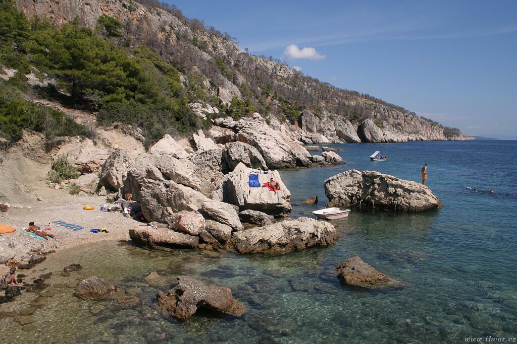 Pohled z pláže k východu. Ze skalisek je možné také skákat.