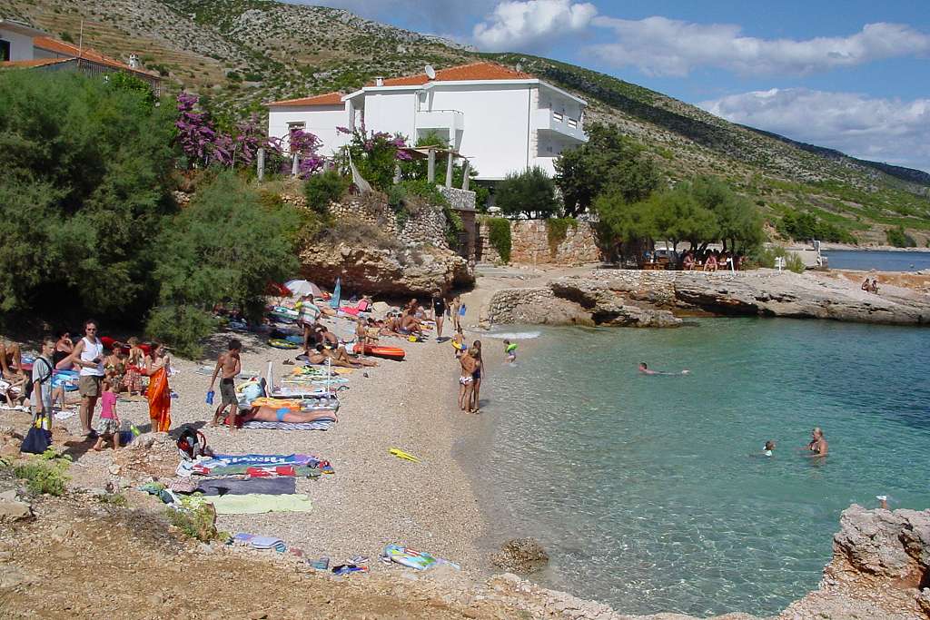 Hosté několika penzionů v zátoce Petarčica využívají kromě oblázkové pláže i betonová mola a plošiny vybudované na skalnatém pobřeží.