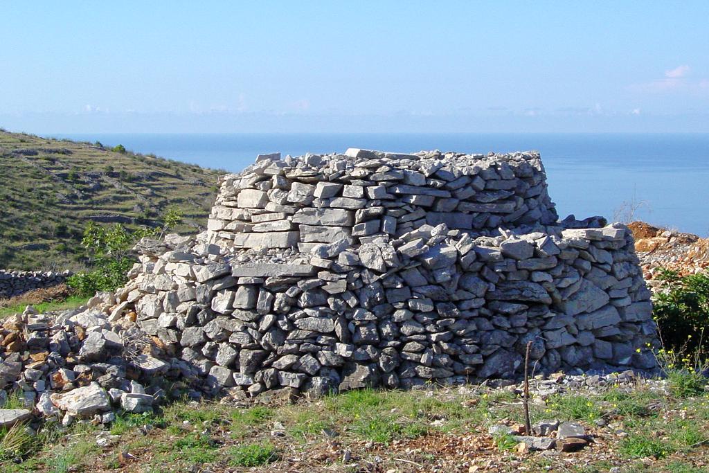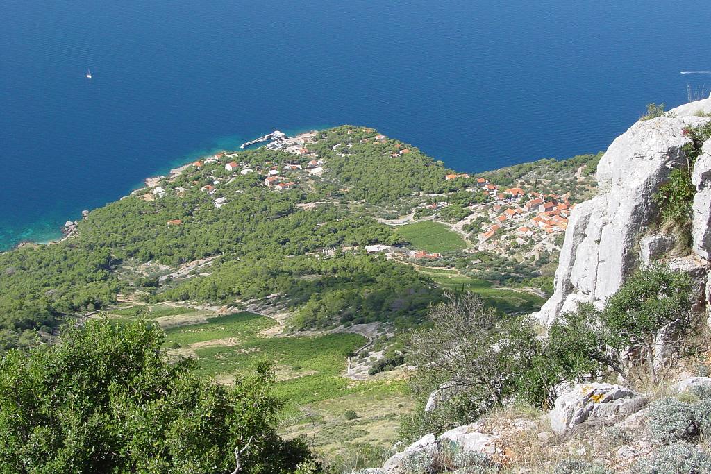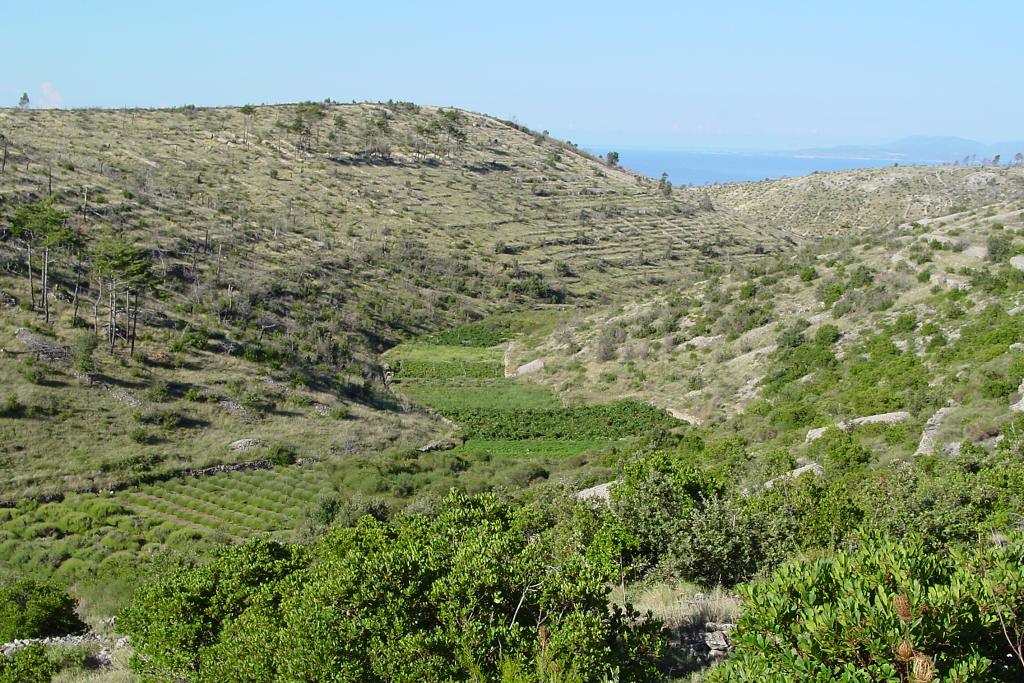 Krajina kolem je dost pustá, kamenitá, téměř bez stromů, jen s nízkou vegetací. Podle kamenných zídek se dá soudit, že tu kdysi bývala políčka, která i na takto odlehlých místech vesničané obdělávali. Míjíme několik starých přístřešků z navršeného lomového kamene, kam si místní schovávali své nástroje a mohli se skrýt před nepohodou, případně přespat. Na Hvaru se jim říká trim, jinde kažuni či bunje. Mnohé jsou dobře dochované. Jen na jediném místě jsme viděli pečlivě udržovaný vinohrad s domkem a pak malá políčka na dně hlubokého údolí. Metlou pro zdejší krajinu se staly požáry. Největší tu byl v roce 2003. Na mnoha místech jsou vidět vypálené, stále zcela pusté plochy. Tam kde dříve býval les, zůstaly jen ohořelé kmeny stromů.